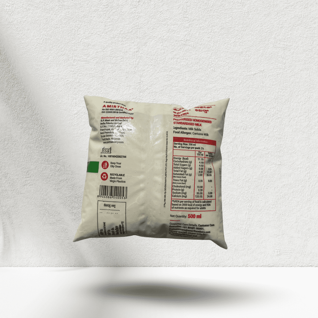 Amirthaa 500Ml Standardised Milk, 4.5%, Packet