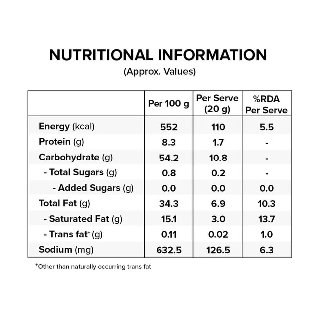 Energy (kcal) 552.0, Protein (g) 8.3, Carbohydrate (g) 54.2, Total Sugars (g) 0.8, Added Sugars (g) 0.0, Total Fat (g) 34.3, Saturated Fat (g) 15.1, Trans Fat (g) 0.11, Sodium (mg) 632.5